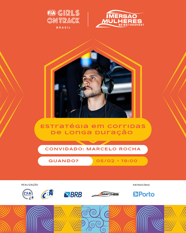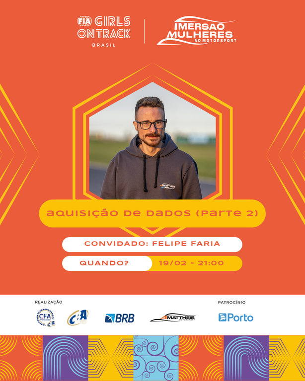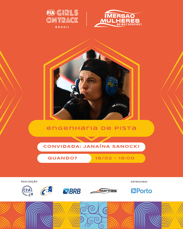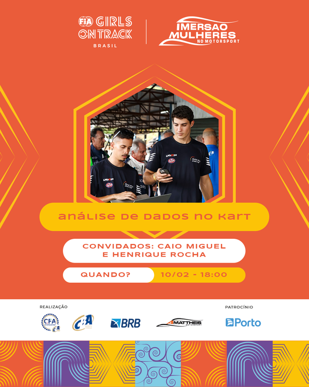 Os palestrantes confirmados são os engenheiros Marcelo Rocha, que atua no Endurante Brasil e outras categorias, e falará sobre estratégia em corridas de longa duração, em 5 de fevereiro; Caio Miguel e Henrique Rocha, da Racing Data, que darão aula sobre análise de dados no kart, em 10 de fevereiro; Felipe Faria, da Equipe AMattheis Vogel na Stock Car Pro Series, que falará sobre aquisição de dados, em 11 e 19 de fevereiro; Janaína Thaís Sanocki, da Porsche Cup, que discorrerá sobre engenharia de pista, em 18 de fevereiro; e Erika Prado, da Equipe TMG na Fórmula 4 Brasil, que dará aula sobre engenharia de pneus, em 20 de fevereiro. Sempre às 19h.