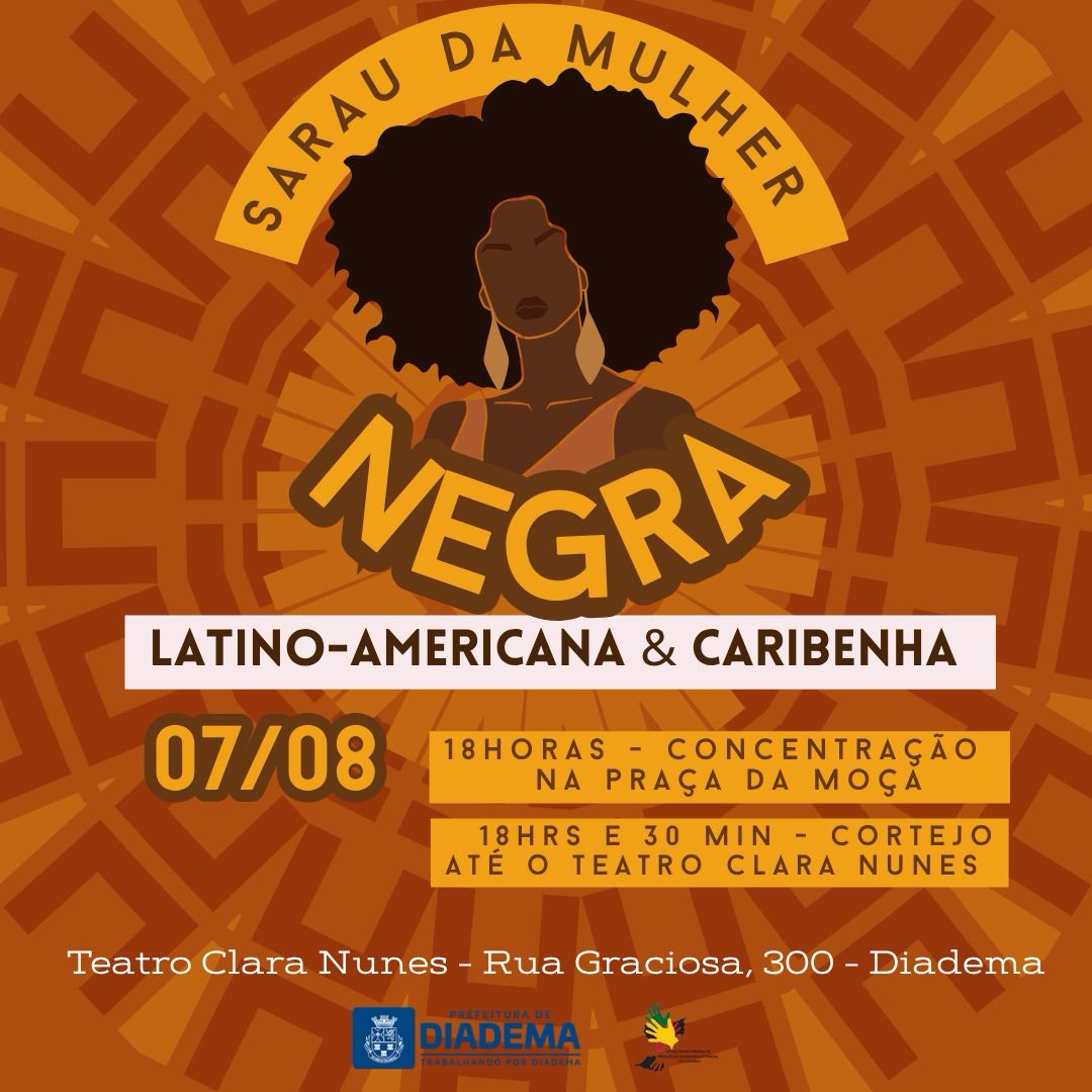 A Coordenadoria de Promoção de Políticas de Igualdade Racial (CREPPIR) convida toda a população de Diadema para o Sarau da Mulher Negra, que acontecerá nesta quinta-feira (7/8). Este evento será uma celebração do Julho das Pretas, em reverência ao Dia da Mulher Negra Latino-Americana e Caribenha e ao legado de Tereza de Benguela.