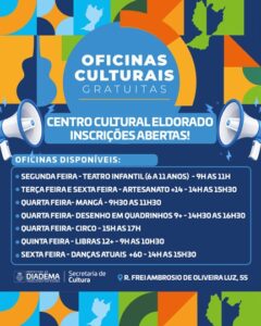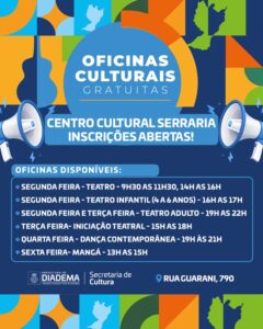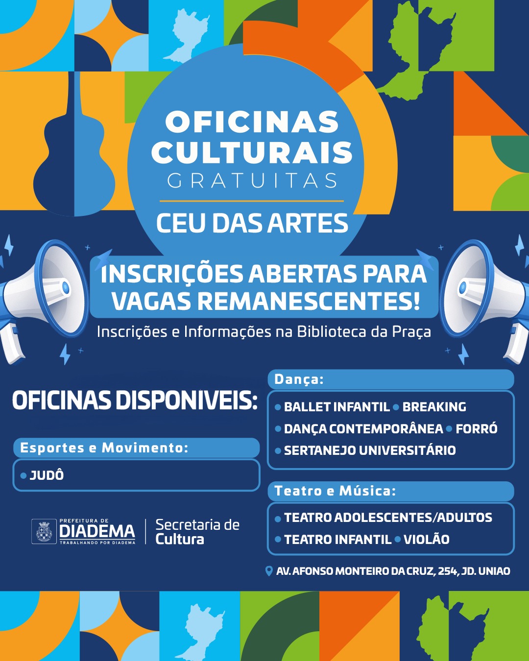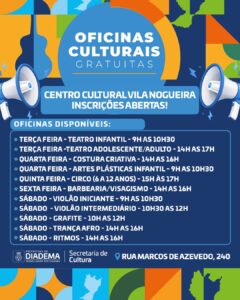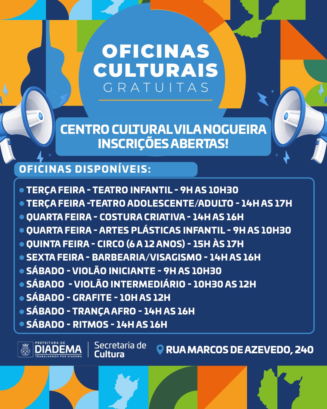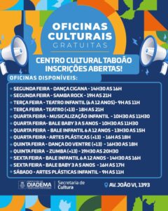 A Prefeitura de Diadema, por meio da Secretaria de Cultura, está com inscrições abertas para as Oficinas Culturais gratuitas oferecidas nos Centros Culturais Taboão, Serraria, Vila Nogueira e Eldorado. As atividades contemplam diferentes linguagens artísticas, como teatro, dança, música, artes plásticas, artesanato e muito mais, destinadas a crianças, jovens, adultos e idosos.