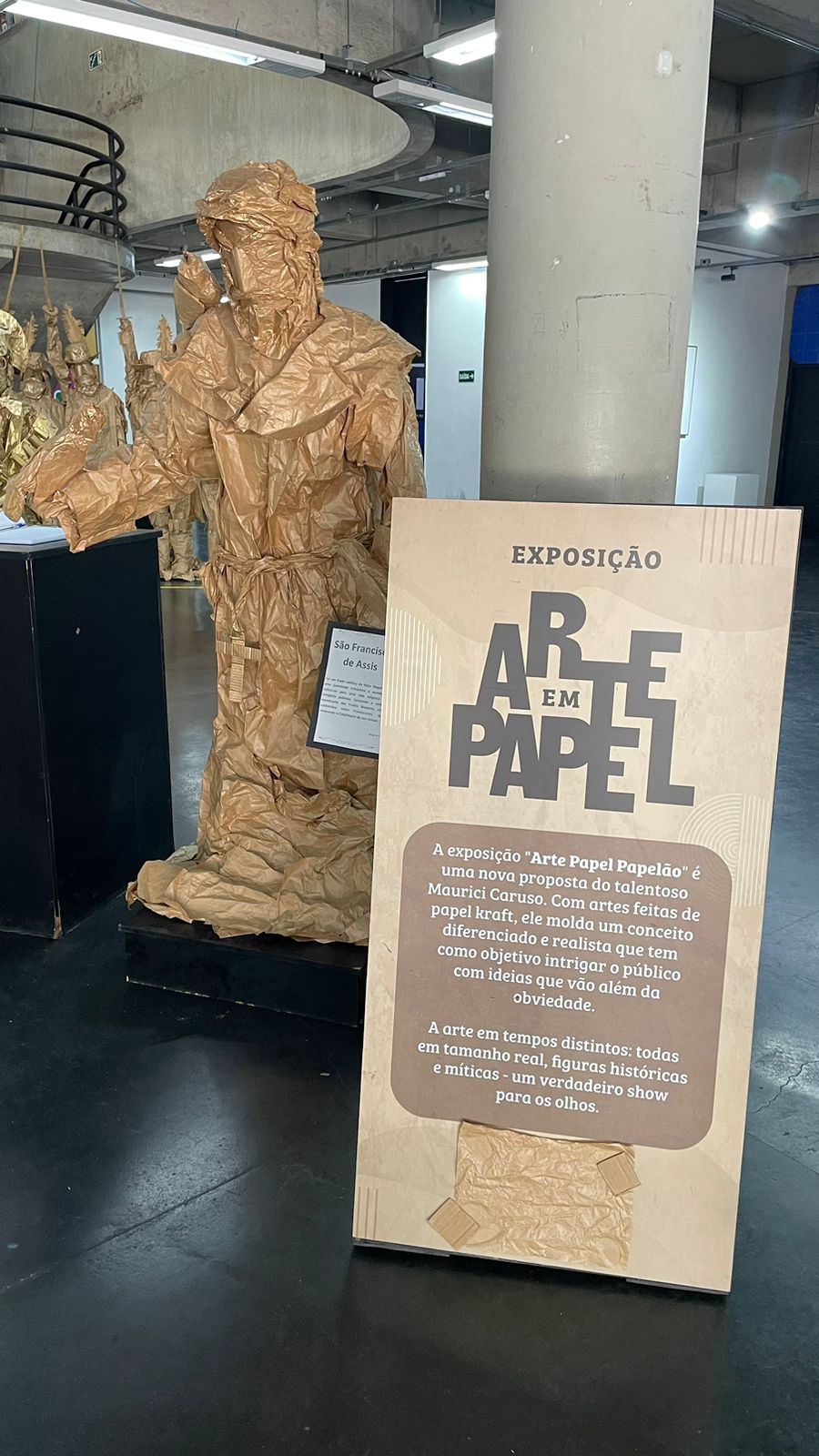 A mostra reúne obras produzidas integralmente em papel kraft, explorando a simplicidade e, ao mesmo tempo, a potência desse material como suporte artístico. Caruso propõe um diálogo entre arte e cotidiano, ressignificando o papel em esculturas e composições que evidenciam textura, movimento e expressão.