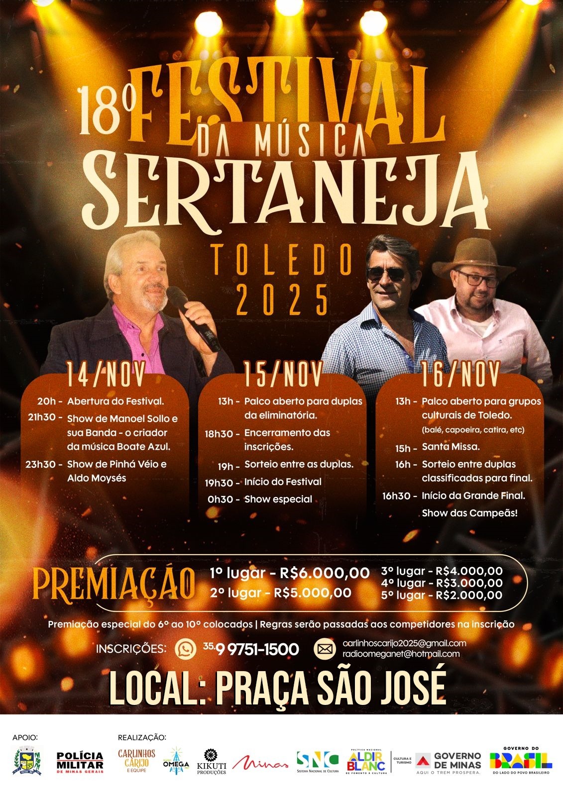 O Festival da Música Sertaneja de Toledo 2025 é realizado com recursos da Lei Aldir Blanc, por meio da Secretaria de Cultura e Turismo de Minas Gerais.
